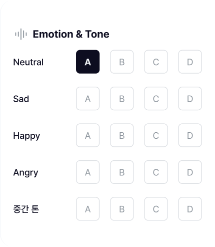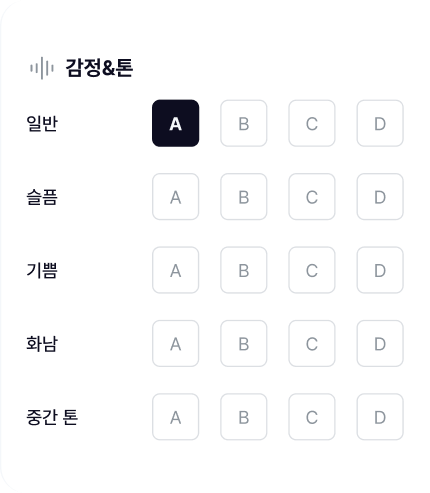 낮은 음색부터 높은 톤까지, 범위·억양·발화 속도 등을 AI가 분석하여 자연스럽고 감각적인 AI 음성으로 변환합니다.